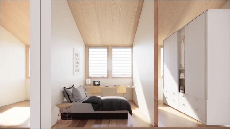 L’estructura vertical i horitzontal es construirà amb bigues i pilars de fusta laminada.